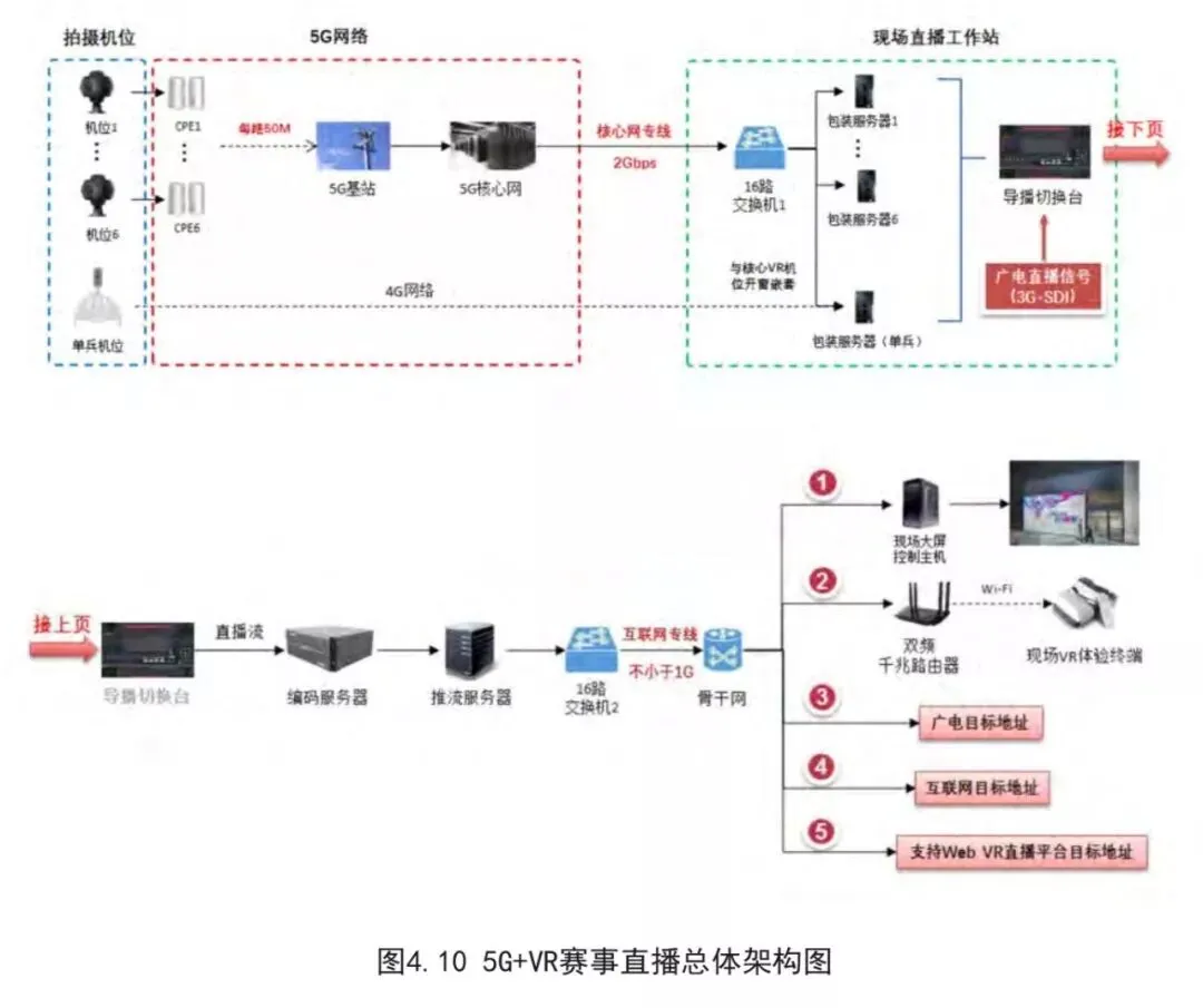 本次比赛采用6路专业级VR摄像头同时推50M全景4K码流,通过5G网络连接到直播工作站,直播工作站每路机位配备一台服务器用于图文包装,然后将全景多机位视频信号、广电直播节目信号、单兵全景视频信号在导播台切换后输出最终视频流,通过互联网专线推送给运营商直播平台、广电、互联网平台等。