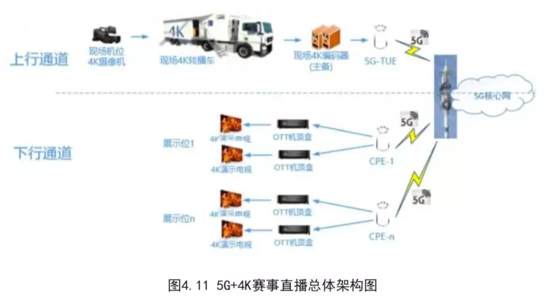 2019年1月18日晚,CBA常规赛第32轮在北京五棵松凯迪拉克中心开赛。此次比赛采用5G+4K直播,从现场导播车直播信号输出,至4K演示电视机接收直播信号,全程都采用5G进行传输。这是CBA比赛首次借助5G网络实现多机位全时段的直播信号传送。本次直播基于5G网络进行4K信号的上行回传,首先由现场多机位4K摄像机拍摄后,原始基带视频经4K转播车完成制作后输出4K视频IP流,码率为50Mbps。通过5G室外宏站提供的网络覆盖和2套CPE提供的主备上行通道,进行4K视频流的实时高速传输。4K下行信号为现场演示信号,由演示用机顶盒从CDN流媒体服务器上拉取4K演示信号。4K下行信号的5G信号由5G室内宏站提供,使用4套CPE分别为4个机顶盒提供下行通道并展示在4台4K电视。