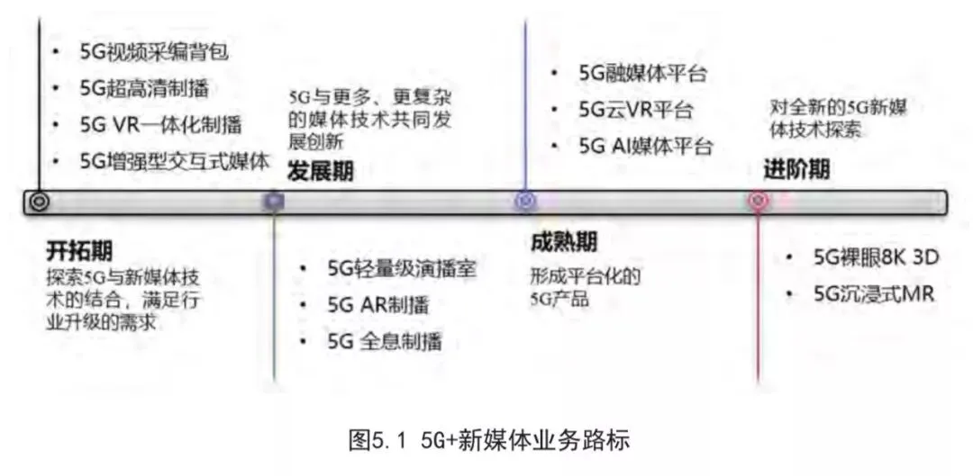 随着5G技术和新媒体业务结合的不断深入,5G新媒体应用也将从初期的采、编、传逐渐渗透到云化制作生产、全息通信的引入,以及形成平台化的生产传播融合平台,并面向未来探索沉浸式体验等更新的技术,对5G新媒体业务发展路标的预测如下图:
