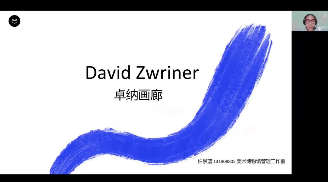 第一位发言人是艺术管理与教育学院本科三年级的柏景蓝同学,他分享的主题是《大卫卓纳其人及其领导下的画廊业务发展》。柏景蓝通过画廊发展时间线的梳理,完整呈现了卓纳画廊是如何在创始人大卫·卓纳的带领下起步、扩张并走向成熟,一步步成为国际性知名画廊。其次,通过深入分析卓纳画廊的业务板块,他认为该画廊已不再局限于传统画廊角色,而是通过进军新媒体、二级市场研究、出版业以及线上化平台积极拓宽自己的业务边界。