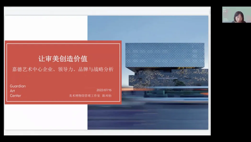 本次交流会第二位发言人陈兴怡同学带来了题为《让审美创造价值:嘉德艺术中心企业、领导力、品牌与战略分析》的演讲。在对嘉德艺术中心的研究过程中,陈兴怡不仅采取了访谈研究法,直接对谈嘉德艺术中心展览部工作人员,深入了解嘉德艺术中心各项工作和组织架构;而且还从企业的组织与团队、领导力的管理与创新、品牌的坚守与裂变以及战略的规划和实施四个方面深入分析嘉德艺术中心。最后,她指出嘉德艺术中心在未来还需要关注公共价值与专业价值、艺术市场与艺术理想、高端客户与普通大众等方面的平衡问题。