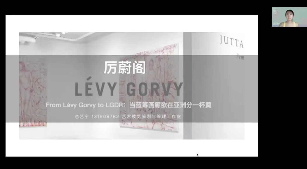 在题为《From Lévy Gorvy to LGDR:当蓝筹画廊欲在亚洲分一杯羹》的主题演讲中,第三位分享者池艺宁同学聚焦近些年变化不断的Lévy Gorvy画廊。她认为从Lévy Gorvy(厉为阁)到厉蔚阁再到LGDR这个过程,既见证了该画廊团队经历的重大人事变动,同时也标志着全球蓝筹画廊的一次重大整合。除此之外,不论是空间选址、对亚洲艺博会的重视还是香港空间的精品展览都体现出LGDR在亚洲地区的扩张企图。池艺宁认为在代理艺术家和业内合作方面,LGDR也具有非常鲜明的特色,而其创始人们拍卖行的出身则使得该画廊区别于业内其他画廊,对二级市场格外的重视。