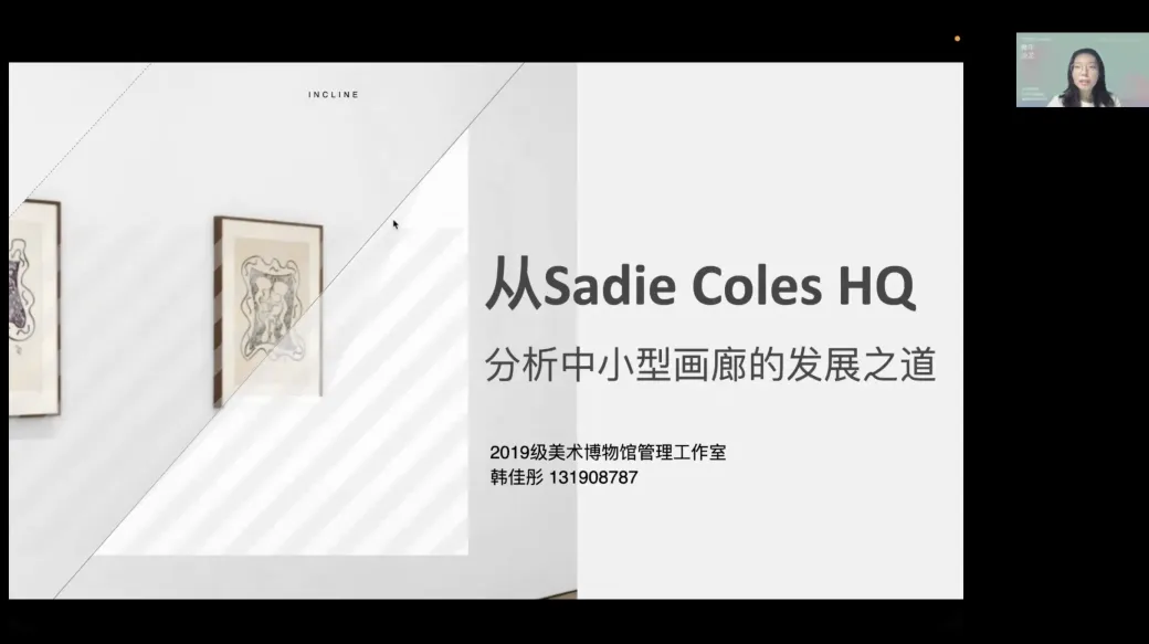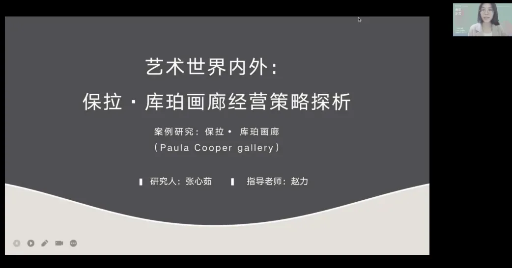 本次交流会最后一名分享者张心茹同学带来题为《艺术世界内外:保拉·库珀画廊经营策略探析》的演讲。从内生变量和外生变量两个方面入手分析其经营策略,张心茹认为由于对艺术市场趋势判断具有前瞻性,加上独特的艺术理念、先进的运营模式,在大时代背景的加持之下,保拉·库珀画廊因而能脱颖而出迅速发展。此外,通过5P分析模型,她指出保拉·库珀画廊战略可以总结为计谋(ploy):给予在世艺术家和新兴艺术家更多关注;模式(pattern):私人画廊经营模式,线下实体为主、线上为辅;计划(plan):遵循循序渐进的方式进行艺术作品的收藏与销售;观念(perspective):观念艺术与极简艺术为核心和定位(position):国际型画廊&世界艺术市场领先者。在演讲最后,面对新冠疫情给全球画廊业带来的危机并结合中国艺术品市场,张心茹提出中国画廊需要重视长期经营策略的规划和制定,注重短期经营策略的应对与调整。