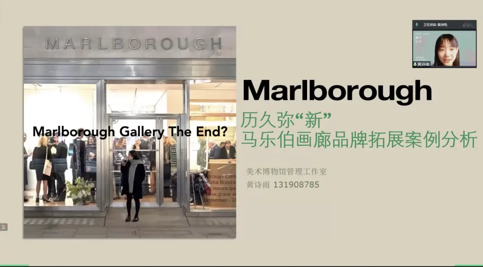 交流会第五位发言人黄诗雨同学以《历久弥“新”:马乐伯画廊品牌拓展案例分析》为题,独辟蹊径向大家展示了一个目前似乎陷入危机的画廊——马乐伯画廊。画廊创始历程背后体现的早期领导力和决策力、版图扩张背后的国际视野、以家族为核心的企业管理以及优异代理绩效背后体现的独到而又准确的艺术眼光让早期的马乐伯画廊开启对画廊运营模式探索的先河。但是在互联网时代,马乐伯画廊的宣传造势、营销与公关没能跟上其高质量艺术水平,加上领导人错误的战略决策与疫情危机都让这个老牌画廊暂时深陷低谷。黄诗雨认为该画廊能否够逆风翻盘需要依靠领导与团队针对现有的状况如何制定一个长期的、综合各个层面的发展战略。