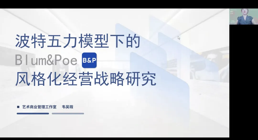 第八位发言人韦吴瑕同学的演讲主题是《波特五力模型下的风格化经营战略研究:以Blum&Poe为例》。她的研究采用波特五力模型、三大竞争战略和PEST模型深入分析Blum&Poe画廊的竞争环境、内部具备的优势与劣势以及外部面临的威胁与机会。此外,她认为通过对村上隆和奈良美智等日本艺术家以及韩国单色画艺术的挖掘与推广,Blum&Poe画廊不仅成为异文化的推介者、翻译者,而且成为异文化艺术品的缔造者。最后,韦吴瑕总结Blum&Poe画廊能够大获成功离不开优化资源配置、对细分领域深度经营和集中藏家资源这三个方面。