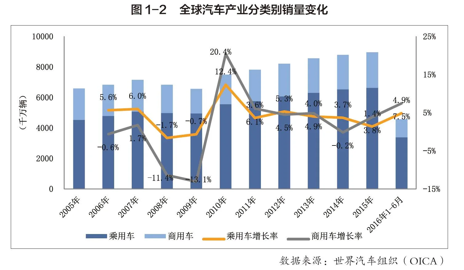 随着全球汽车工业的发展,汽车产业是世界上规模最大的产业之一,并成为美国、日本、德国等发达国家国民经济的支柱产业,对工业结构升级和相关产业发展有很强的带动作用。2010年汽车销量增长最快,达到14%,2016年受到全球经济低迷的影响,汽车销量仍保持低速增长,截止到2016年6月,汽车销量同比增长3%。