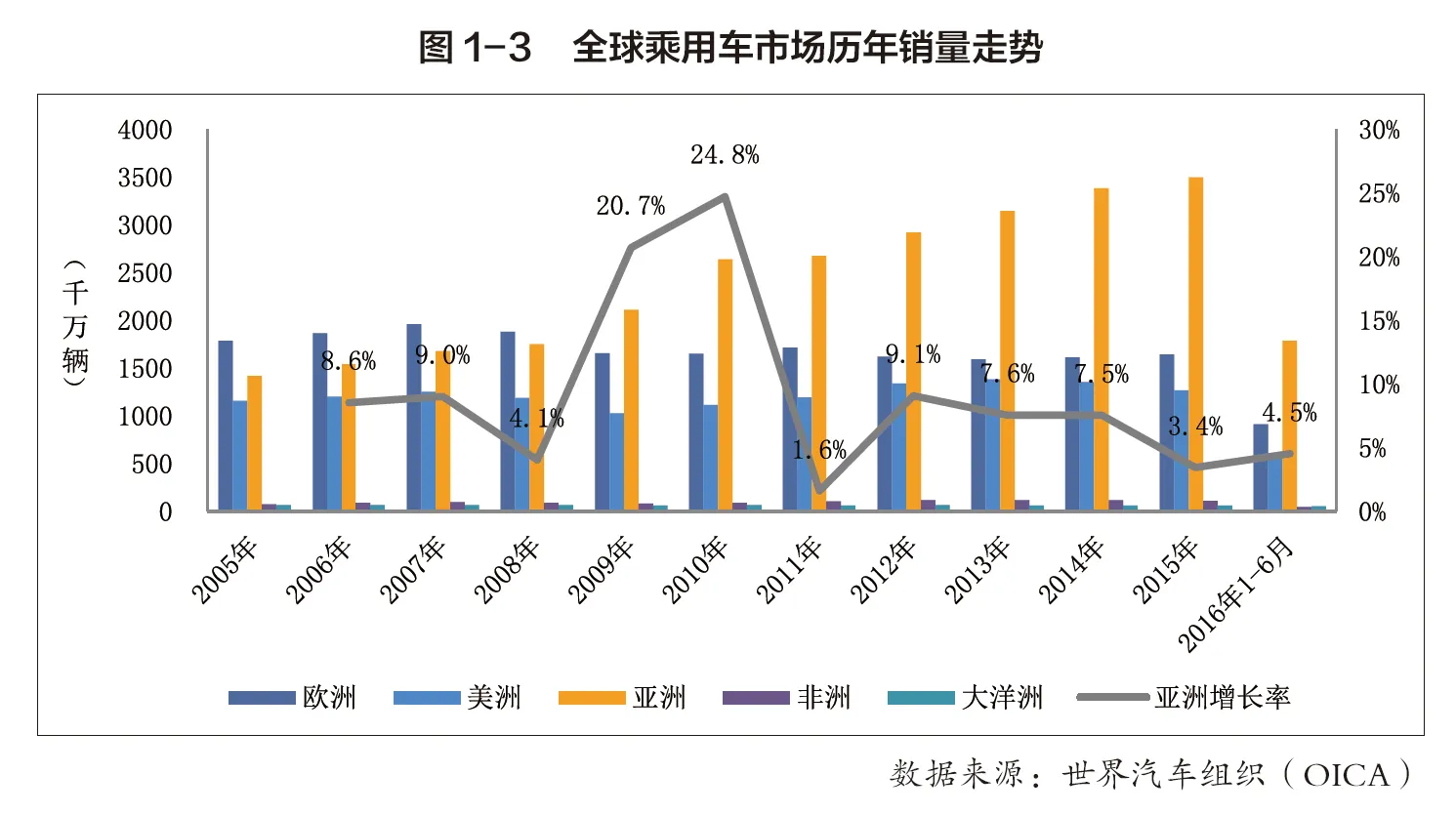 全球乘用车②的增长主要来自于亚洲。从2009年起,亚洲汽车销量超越欧洲,成为全球乘用车销量的NO.1,从2013年开始,亚洲乘用车销量占世界乘用车总销量50%以上,2015年占全球乘用车市场份额达到53%,且亚洲销量超过美洲与欧洲销量总和。近两年,亚洲销量增速下滑,但仍高于美洲与欧洲的汽车销量增速。2015年亚洲乘用车销量增速为3%,欧洲为2%,美洲为-6%,2016年上半年乘用车销量与同期相比,亚洲增长率为5%,欧洲为7%,美洲为-9%。同时,就千人保有量而言,欧洲的千人保有量居于世界之首,美洲以美国、加拿大为主,其千人保有量在处于较高水平。因此,这些国家和地区的乘用车需求与亚洲相比相对较小,乘用车市场增速缓慢。因此,未来汽车销量增长的主要市场在亚洲,亚洲经过多年的快速增长,2011年以后,销量增速逐渐下滑,增速比较稳定,并且销量增长绝对量遥遥领先。