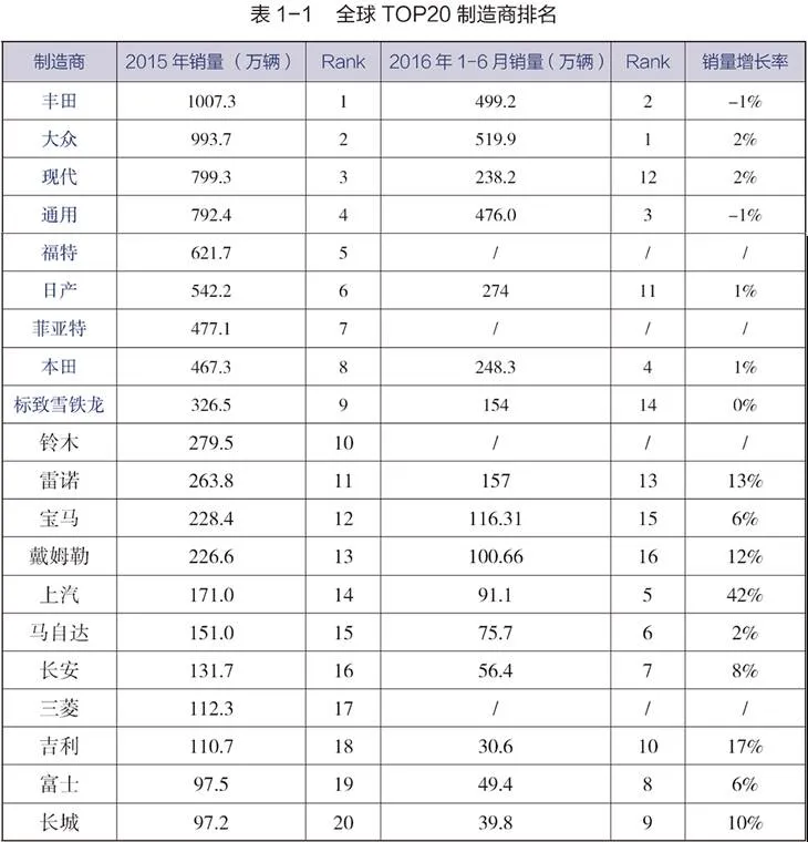从竞争格局来看,2015年,上汽、长安、吉利、长城跻身与世界前20名,振奋了中国汽车工业。从2016年上半年各汽车集团公布的数据来看,除福特、菲亚特和铃木外,其他汽车制造商公布的数据可以看出,大众上半年重回冠军宝座,丰田以微弱优势位于第二,现代销量大幅下滑,跌出三甲。中国制造商上半年销量增长迅速,特别是上汽,同期增长率达到42%。近年来,中国汽车企业崛起,其研发、制造水平不断提升,全球销量增长迅速。