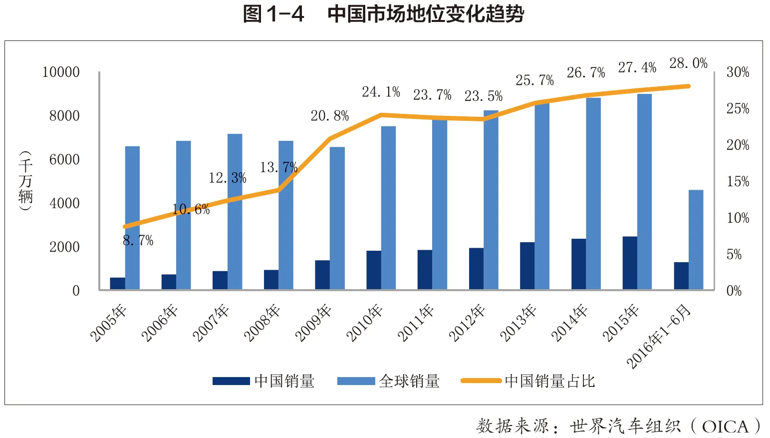 2009年,中国汽车市场占全球汽车市场比重从2008年的14%增至21%,目前中国在全球汽车市场的占比达到27%。从2009年开始到2015年,中国已连续多年汽车销量排名世界第一,2016年1-6月,中国占世界销量比重为28%。2016年1-6月,中国汽车总销量与亚军美国相比,是美国汽车总销量的1.46倍。