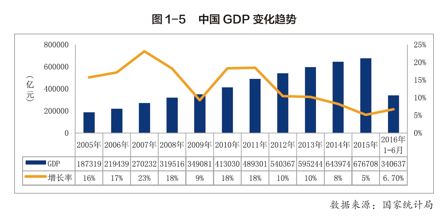 从2007年以来,中国GDP增速明显下降,2015年GDP增长率降至5%,创历史最低增长率。2016年上半年,根据国家统计局统计数据显示,中国经济运行保持稳定,GDP增长6.7%,高于全年预期目标阈值的下限,当前我国经济仍处于稳步增长的发展阶段。