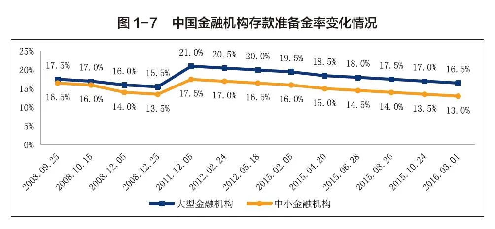 与此同时,中国央行已经13次调整金融机构存款准备金,以进一步降低企业融资成本,促进企业投资增长。如下图所示,中国金融机构准备金率调整变化趋势:
