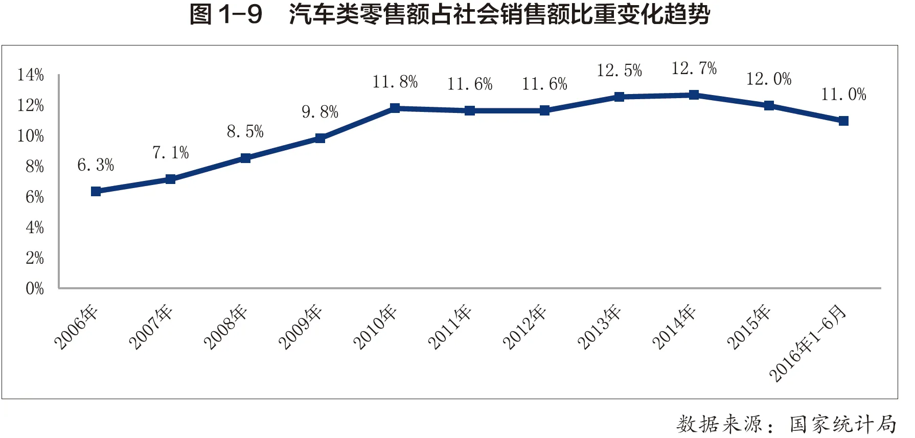 2016年1-6月,全社会固定投资增长率为9%, 消费品零售总额增长率为10.3%。汽车消费2006年仅占社会消费品零售总额的6%,随着经济的发展与国家的调控政策,占比逐年提升,2009年已达到10%,之后始终以10%以上的增速快速发展。汽车消费快速家庭,汽车已成为中国消费者重要的消费品,中国汽车消费逐年提升,汽车千人保有量并在2015年突破100台。