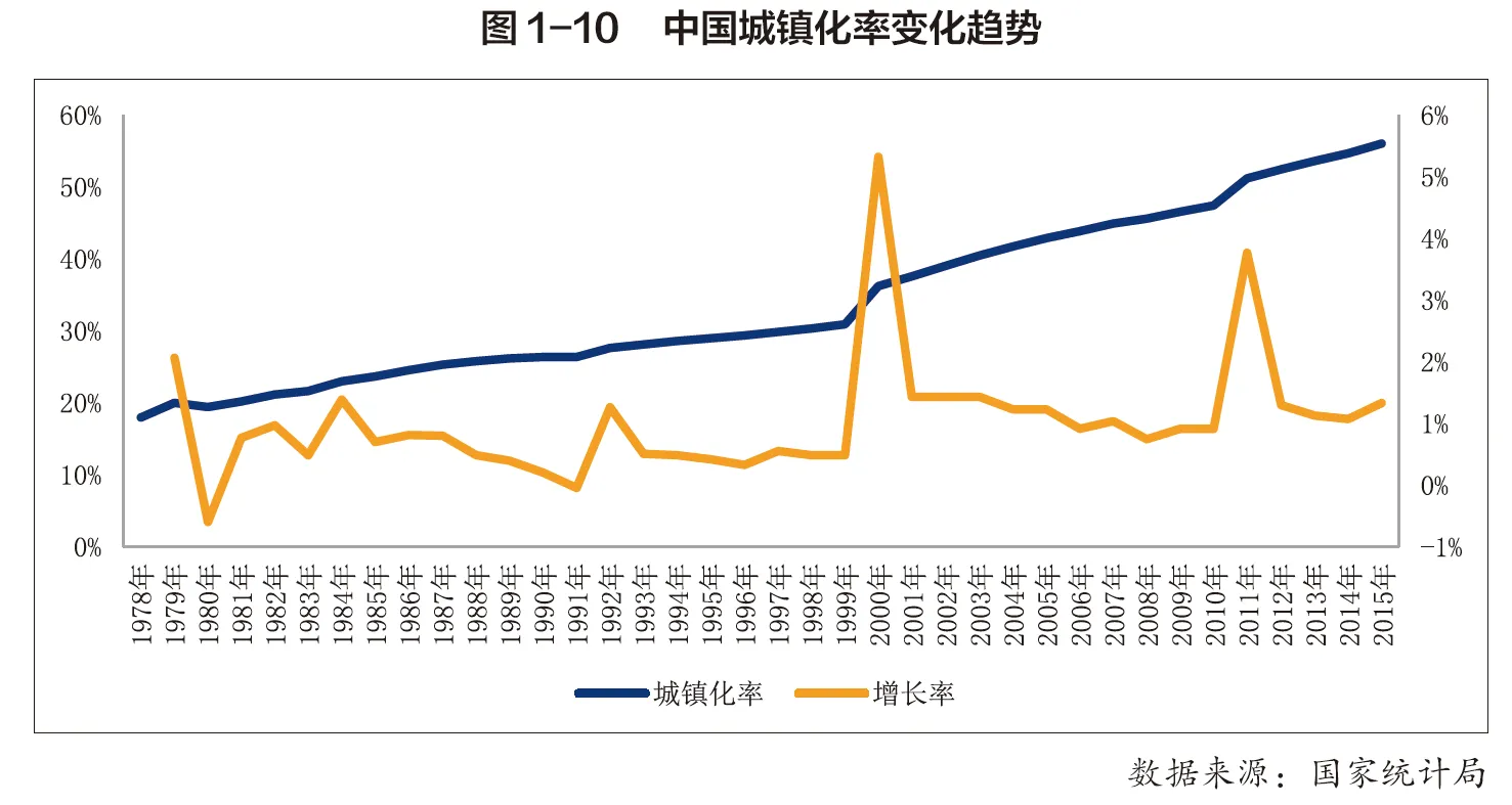 我国从1978年改革开放以来,中国城镇化率逐年提高,进入21世纪以来,中国城镇化发展迅速,2000年城镇化增长率达到历史最高5.33%。2010年以后,中国城镇化率超过50%,2015年,我国城镇化率达到56.1%,城镇常住人口达到了7.7亿。虽然农业转移人口市民化进展比较缓慢,户籍人口城镇化率还比较低,但是一部分城镇人口属于没有解决户口的“半城镇化”,但其实际居住地、工作地、生活方式等已基本城镇化。随着交通、通讯等基础设施的大规模改善,随着城乡经济交流的日益频繁,许多农村特别是郊区农村和交通沿线农村已基本城镇化了,享有与城市居民接近的城市文明。