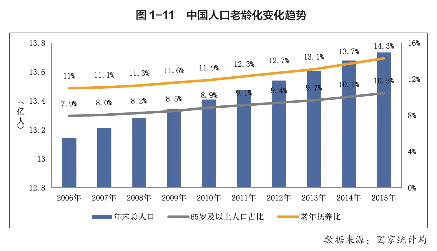 按照联合国标准,65岁以上老年人口占人口总数的7%,即意味着这个国家或地区的人口处于老龄化社会。2001年,我国65岁及以上老年人口占比达到7.1%,如上图所示,在2015年底,65岁以上人口占比已达到10%。可预见中国65岁人口还将持续增长。我国进入人口老龄化社会时,物质财富积累则相对不足,经济发展压力依然较强。