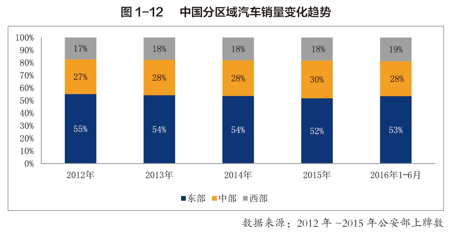 由上图可知,全国汽车销量在各个区域的市场份额基本保持不变,但是,随着经济的发展,由东部向中部与西部推进,人均GDP普遍上涨,汽车消费逐年提升,东部地区大多为一二线城市,汽车千人保有量极高,城市汽车接近饱和,销量占比呈现微小下降,销量年增长率逐年下滑,2015年已降至10%;中部地区汽车销量市场份额微小上涨,汽车销量增长率2015年达到22%,远高于东部城市的增长率;西部地区汽车销量份额提升缓慢,但汽车销量增长率较快,2013年汽车销量年增长率达到23%,2015年下滑至15%,但仍高于东部地区。2016 年1-6月,东部地区销量占总销量的53%,中部地区占28%,西部地区占19%。东部地区微涨1%,中部地区略有下滑2%,西部地区上涨1%。可见,汽车销量的爆发增长仍在东部地区,但逐步发展至中部地区,西部地区的销量有待开发,它将是未来汽车销量增长的爆发点。