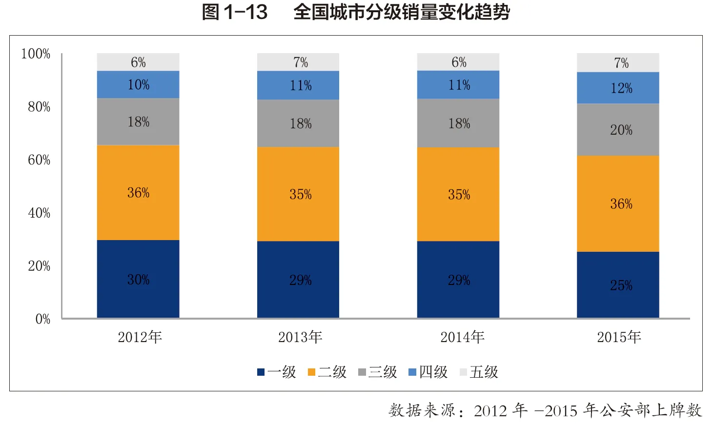 按照城市分级的结果对历年各级城市的汽车销量进行研究发现:汽车需求增长的重心将由一二线城市向更低级别城市下移。一线城市的销售占比从2012年的30%,下降到2015年的25%,二线城市销量市场份额基本保持不变,保持在36%,三线城市汽车销量微增至20%,四线与五线城市的汽车销量市场份额增长了1%。