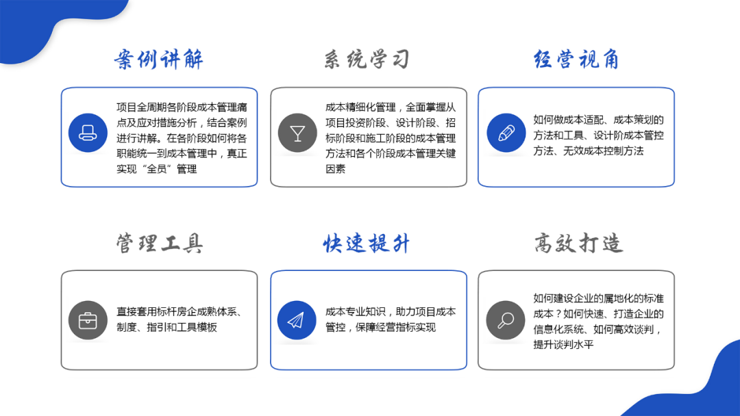 本课程直面全周期各阶段成本的管理痛点,提出了具体的应对策略,策略是基于实战提炼,从实战中来到实战中去。以成本标准化、成本信息化作为基础,通过推行责任成本、无效成本、极限成本等措施,将各个职能真正统一到全周期的成本管理中,实现组合拳式降本增效。
