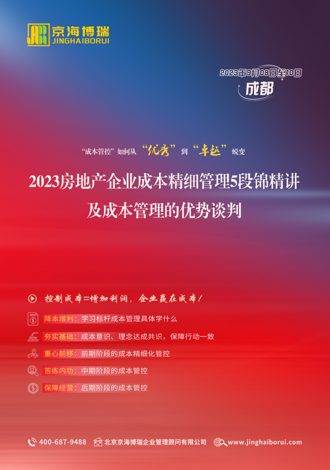 课程背景:后调控时代,高土地成本、高融资成本、高周转难度大、各类生产资料价格不断上涨,销售价格下降,导致地产行业利润率持续下滑,项目亏损时有发生,“三道红线”“限贷”加码出台,货币趋紧政策让房企更是雪上加霜,土地红利、政策红利、资本红利、杠杆红利已纷纷消失,地产行业进入低增长、低利润和低容错的“三低”时代,外部市场的开源远远不能应对残酷的现实,内部节流才是生存之道。
