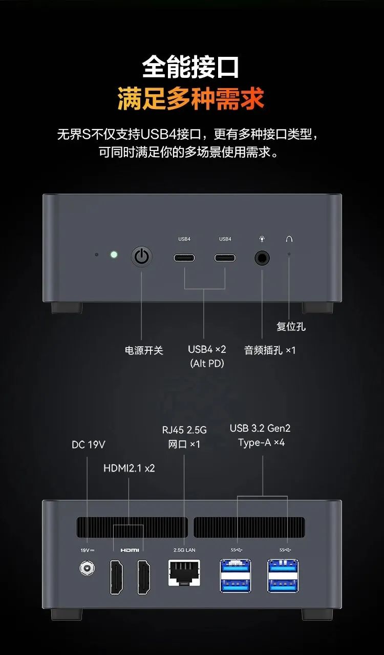 机械革命无界S mini主机正面配备2个USB4、1个3.5mm音频、2个HDMI 2.1、1个2.5G网口、4个USB 3.2 Gen2接口。