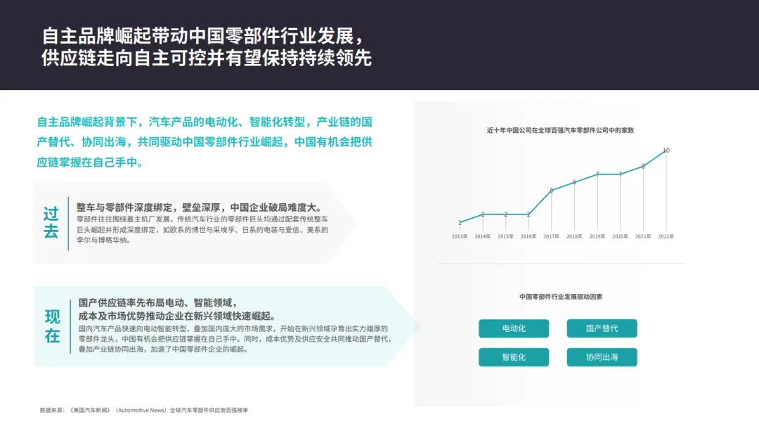 自主品牌崛起带动中国零部件行业崛起,供应链走向自主可控并有望持续领先。