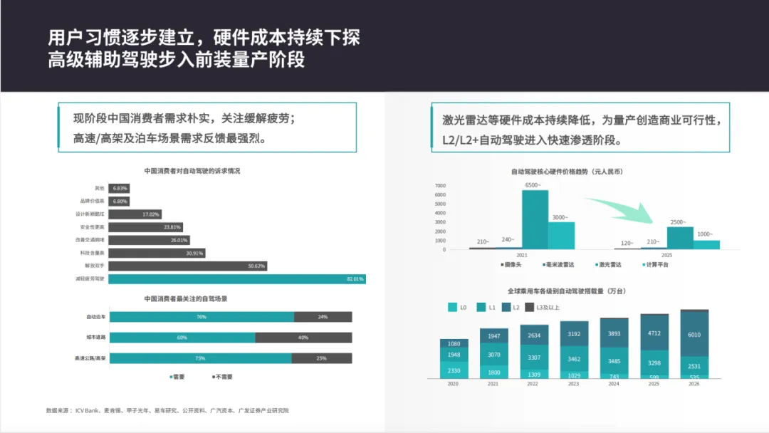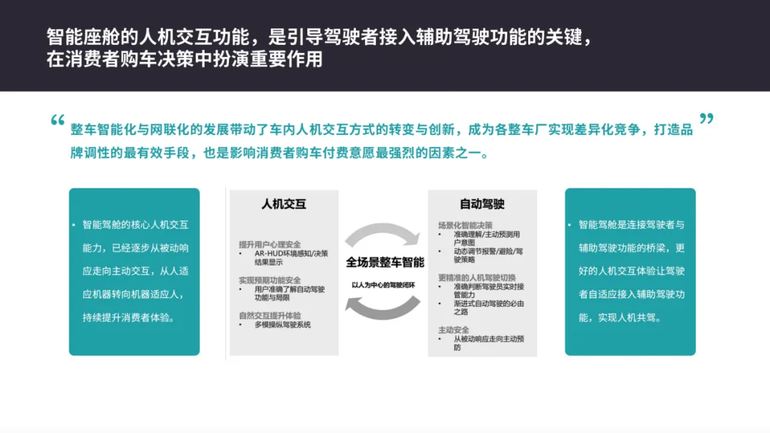 消费者对智能驾舱的付费意愿,已经不仅仅停留在中控大屏、液晶仪表等硬件配置上,持续迭代升级的人机交互方式,在准确接受自动驾驶系统向驾驶者发出的指令后,以更协调、更符合驾驶者习惯的方式进行主动交互,实现无缝对接的人车共驾体验。如此不仅仅带动了消费者对智能驾舱的需求,也间接提升了对辅助驾驶系统的需求。