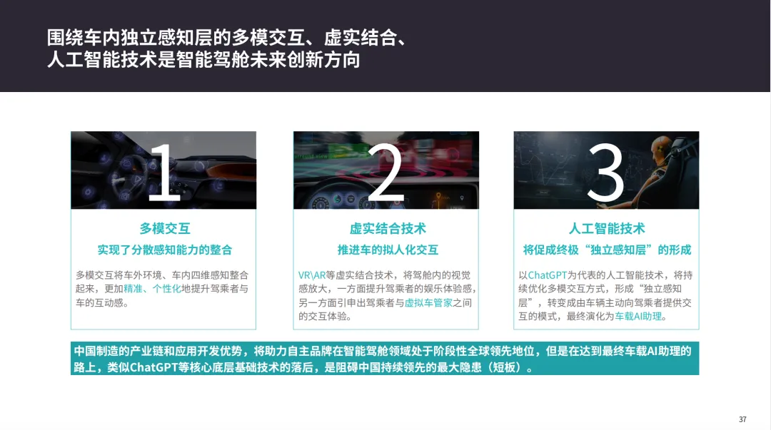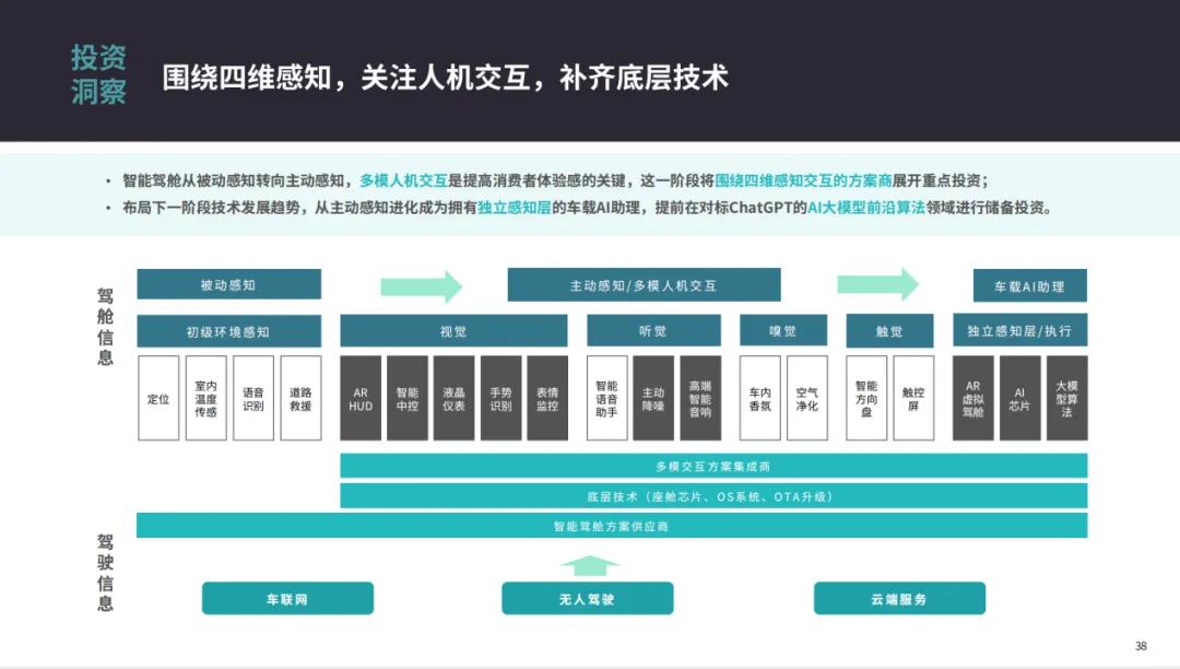 随着使用场景的丰富化和生活化,消费者已经将汽车重新定义为移动的“第三空间”;驾乘者注重在私人空间的体验感,包括智能化、娱乐性、舒适感、高端品质等。围绕提升消费者四觉感知的硬软件供应商和多模交互方式集成商,配合整车厂打造差异化的座舱体验,形成产品核心竞争力,成为汽车产业投资布局的重点。