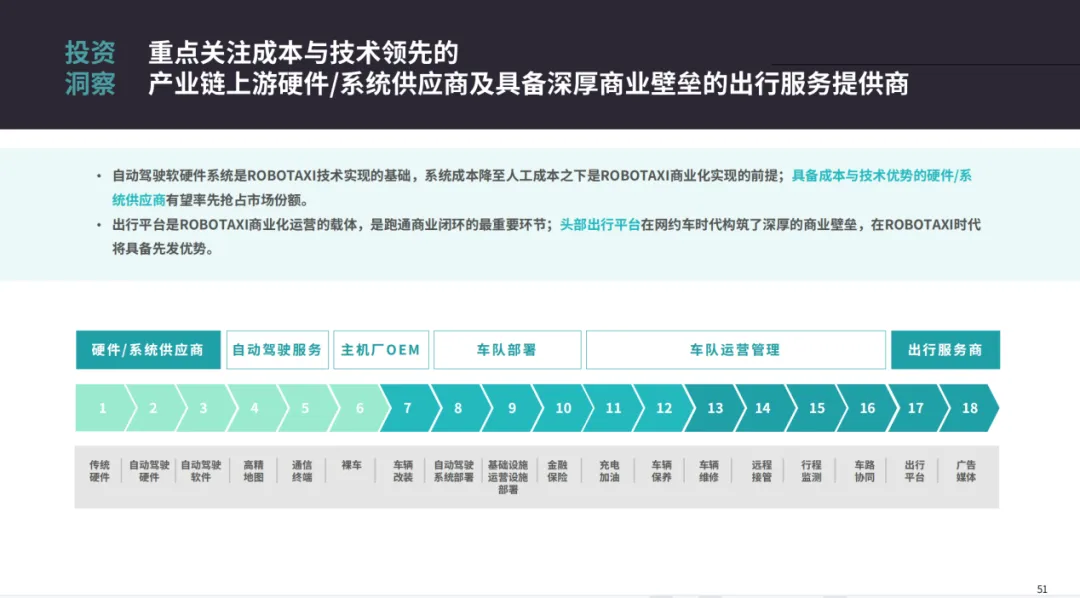 重点关注成本与技术领先的产业链上游硬件/系统供应商,以及具备深厚商业壁垒的出行服务提供商。