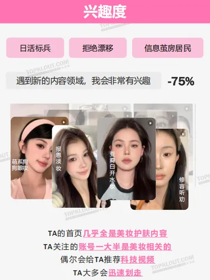 圈层种草机(HPFD):这类用户聚焦垂直兴趣圈,是信任博主的 “精神股东”。他们每天醒来第一件事就是查看关注博主的更新,会分类收藏优质内容并积极分享,对熟悉领域的推荐深信不疑,易被限时、限量等营销催化剂激发冲动消费。美妆深度爱好者泡芙就是典型,她的首页几乎全是美妆内容,对关注三年的博主推荐的产品闭眼入,分享欲爆棚,常把好用的教程转发给闺蜜。