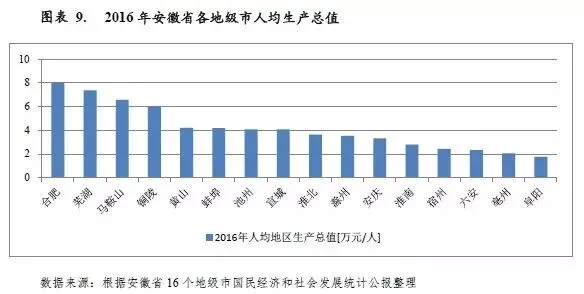 2016年安徽省人均生产总值为3.91万元,其中合肥市、芜湖市、马鞍山市对其拉动作用明显,人均GDP分别为8.01万元、7.37万元和6.56万元[6]。此外,阜阳市经济规模位于全省中游水平,但作为人口大市,其人均GDP仅为1.76万元,位列全省末位。