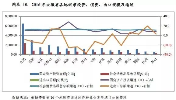 从安徽省各地市的经济发展动力结构看,投资仍是拉动经济增长的第一动力,投资对经济增长的贡献率持续增长;消费对经济增长的贡献率次之,进出口对经济增长的贡献较小。其中,合肥市投资、消费和出口规模在全省均占据绝对优势,且投资与消费持续保持两位数增长,对经济的拉动作用明显;其余各地市的投资、消费和进出口情况较为均衡,投资对经济增长的贡献作用稳居首位。