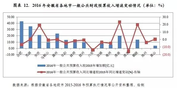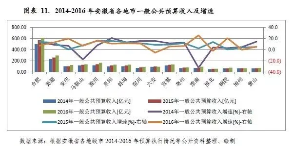 安徽省各地市一般公共预算收入规模与经济发展状况基本保持同步,但增速分化程度明显。2016年受全面推行营改增政策影响,安徽省多地一般公共预算收入增速较上年有所回落,其中六安市和淮北市等部分地市受宏观经济及煤炭、电力、房地产等行业景气度下行影响,财税增收乏力。