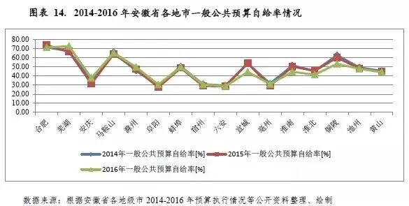 得益于良好的产业基础和上级政府的持续支持,安徽省综合财力位于全国中上游,2016年一般公共预算收入保持稳定增长,但财政自给率仍偏低,收支平衡对上级补助收入的依赖度较高;在房地产市场带动下,当年全省政府性基金收入出现显著回升。