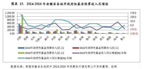 从增速看,2016年合肥市、芜湖市、马鞍山市、蚌埠市、宿州市、亳州市、淮南市和黄山市扭转了2015年政府性基金预算收入大幅下滑的局面,其中蚌埠市、宿州市、亳州市和淮南市均实现两位数增速的大幅增长,合肥市增速更是达133.31%;其余地级市2016年均为负增长,其中降幅较大的地市为六安市和池州市,同比分别下降34.5%和58.2%。