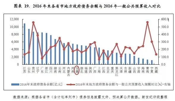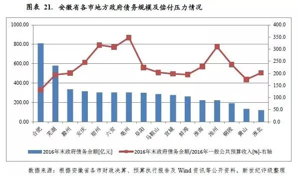 安徽省政府债务余额位列全国中游,地方债务规模与其经济发展水平相适应。与一般公共预算收入规模相比,2016年末安徽省地方政府债务余额是其2016年一般公共预算收入的199%,低于各省市平均水平。与地方财力相对比,当年末安徽省政府债务余额是2016年全省财政收入合计的69%,整体看安徽省政府债务风险可控。