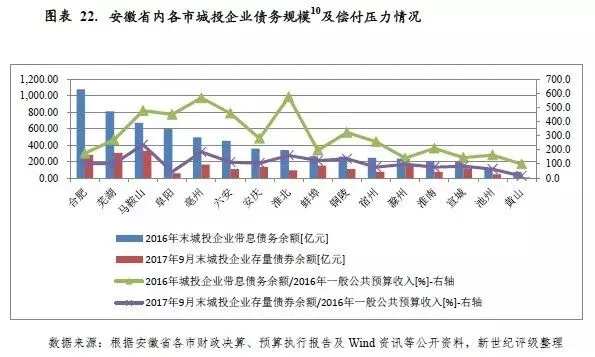 从城投企业带息债务看,2016年末安徽省内79个城投企业带息债务余额为8335.47亿元,是当年末省政府债务余额的157%,与地方财力相比,风险仍可控。截至2017年9月末,上述城投企业存量债券余额为2588.88亿元,占2016年末带息债务余额的31.06%。
