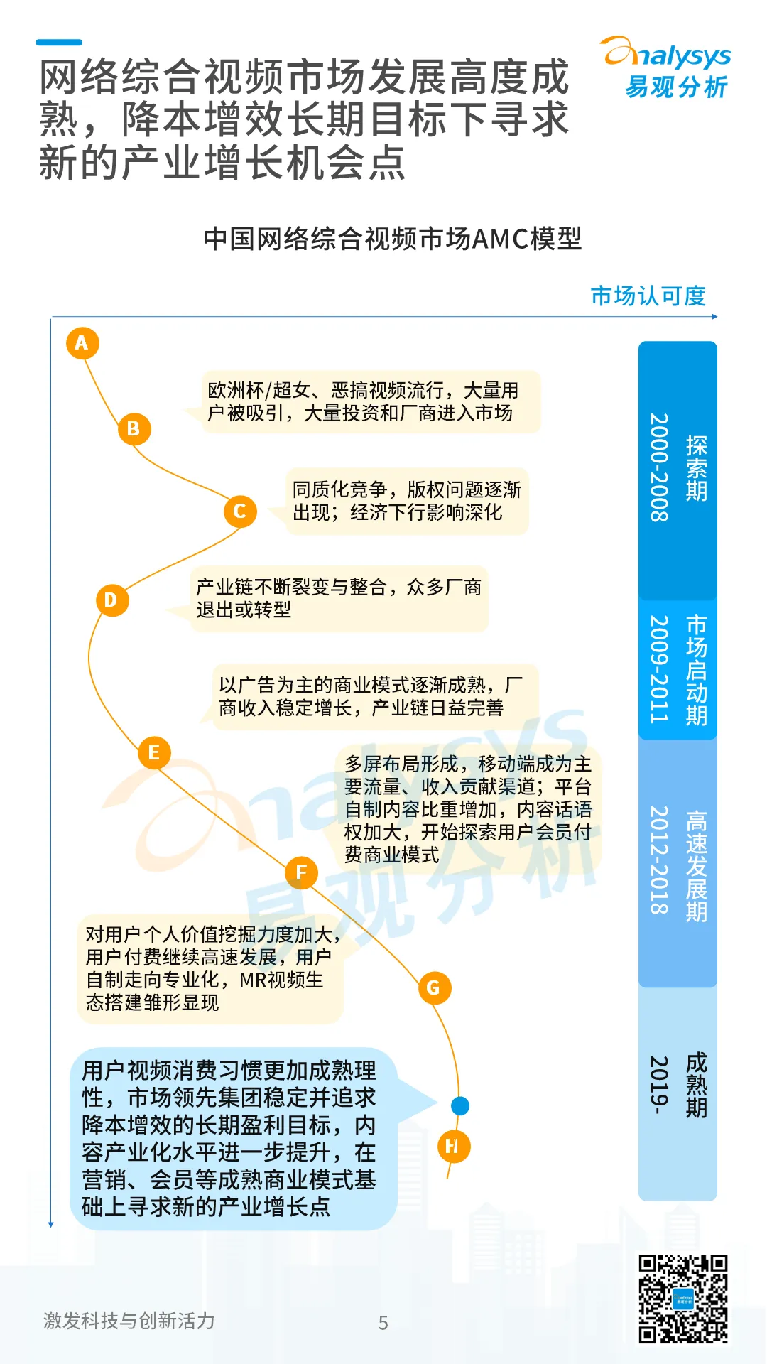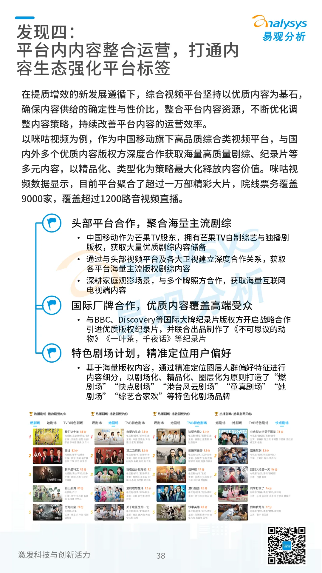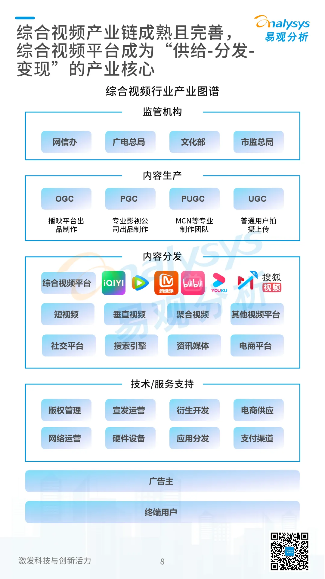 易观分析:目前综合视频产业链成熟且完善,综合视频平台成为“供给-分发-变现”的产业核心,但在用户增长速度放缓、监管趋严的背景下,综合视频平台加快从流量运营向用户运营的思路转变,积极探索更有效的商业模式反哺优势内容的获取成本以收缩平台亏损。更长期来看,综合视频行业在技术升级和内容工业化发展结合下,将更积极探索实现长期盈利的健康持续发展新目标。