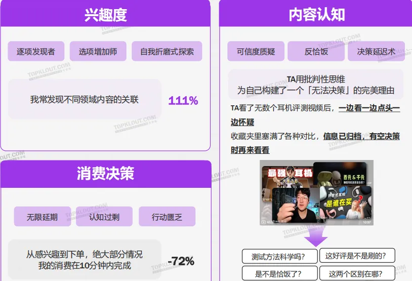 学术猎人(HAMR):他们的乐趣在于 “发现过程”,热衷于在不同领域的交叉点上深度分析,构建互联的网络知识。投入大量时间收集信息,收藏数十篇相关笔记,但决策却因认知成本过高而频繁拖延。资深户外玩家咘咘加入了十几个相关社群,想买登山包时会花两周时间对比参数、查看评测、实体店试背,最终选择性价比最高的款式,而非最热门款。