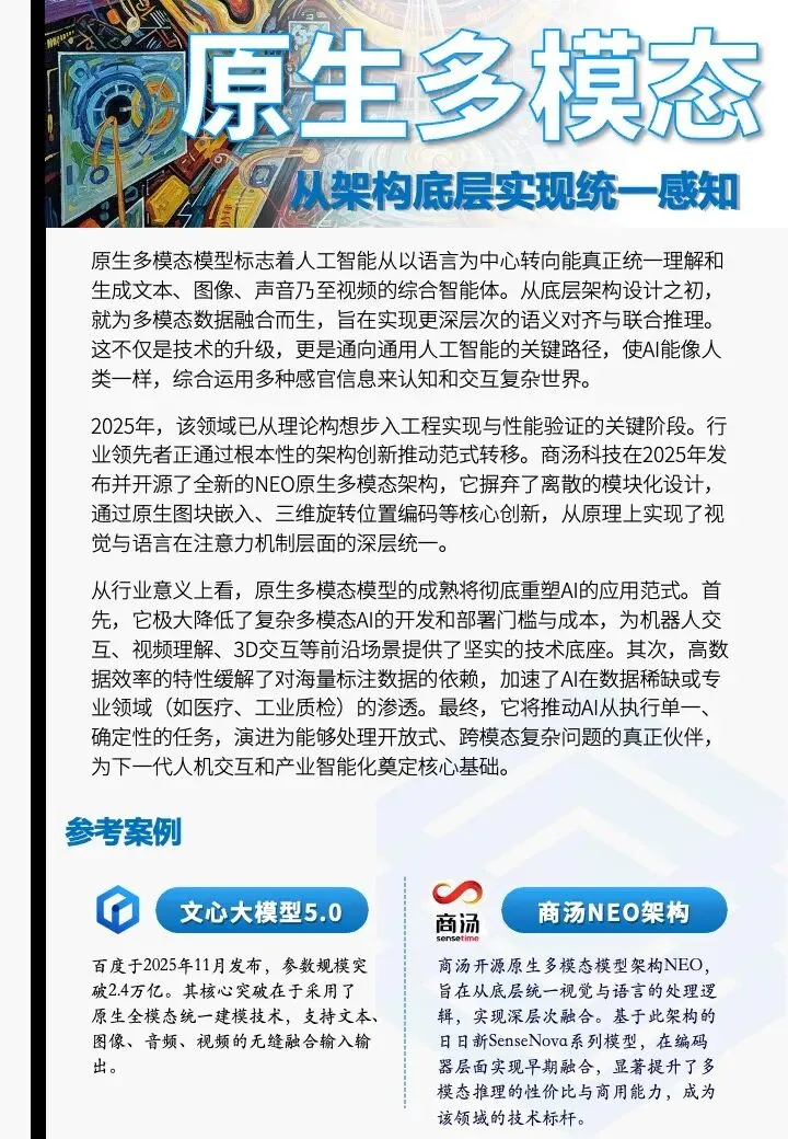 原生多模态模型标志着人工智能从以语言为中心转向能真正统一理解和生成文本、图像、声音乃至视频的综合智能体。从底层架构设计之初,就为多模态数据融合而生,旨在实现更深层次的语义对齐与联合推理。极大降低了复杂多模态AI的开发和部署门槛与成本,加速了AI在数据稀缺或专业领域的渗透。
