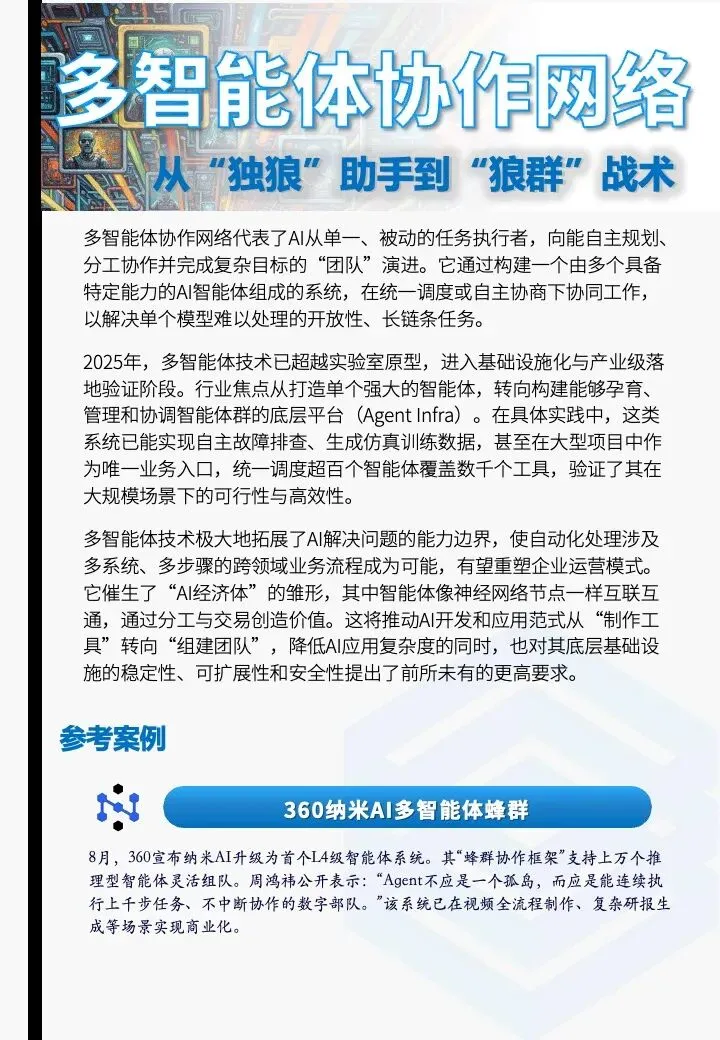 多智能体协作网络标志着AI从单一、被动的任务执行者,向能自主规划、分工协作并完成复杂目标的“团队”演进。2025年,多智能体技术已超越实验室原型,进入基础设施化与产业级落地验证阶段。它极大地拓展了AI解决问题的能力边界,使自动化处理涉及多系统、多步骤的跨领域业务流程成为可能。