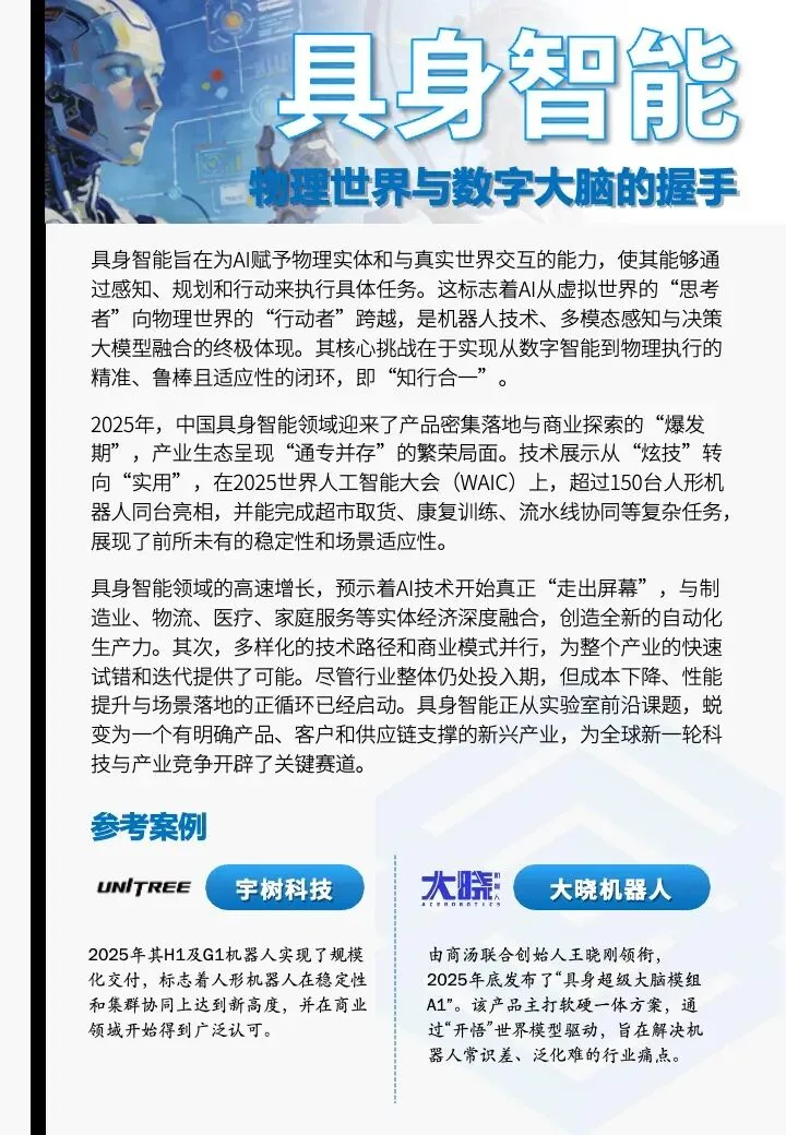 2025年,中国具身智能领域迎来了产品密集落地与商业探索的“爆发期”,产业生态呈现“通专并存”的繁荣局面。具身智能领域的高速增长,预示着AI技术开始真正“走出屏幕”,与制造业、物流、医疗、家庭服务等实体经济深度融合,创造全新的自动化生产力。
