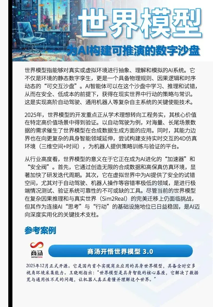 世界模型指能够对真实或虚拟环境进行抽象、理解和模拟的AI系统。它不仅是环境的静态数字孪生,更是一个具备物理规则、因果逻辑和时序动态的“可交互沙盘”。AI智能体可以在这个沙盘中学习、推理和试错,从而在安全、低成本的前提下,获得在现实世界中行动的策略与常识。这是实现高阶自动驾驶、通用机器人等复杂自主系统的关键使能技术。