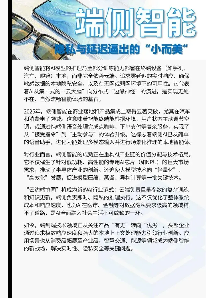 在行业愈发重视隐私与延迟的背景下,端侧智能在商业落地和产品集成上取得显著突破,保证了近乎“零延迟”的实时响应、确保敏感数据的本地隐私安全,以及在无网或弱网环境下的可用性。促进“云边端协同”新行业范式的形成。