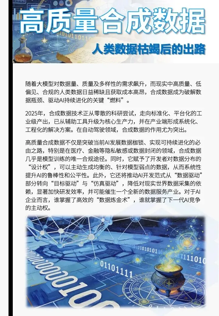 随着大模型对数据量、质量及多样性的需求飙升,而现实中高质量、低偏见、合规的人类数据日益稀缺且获取成本高昂,合成数据成为破解数据瓶颈、驱动AI持续进化的关键“燃料”。