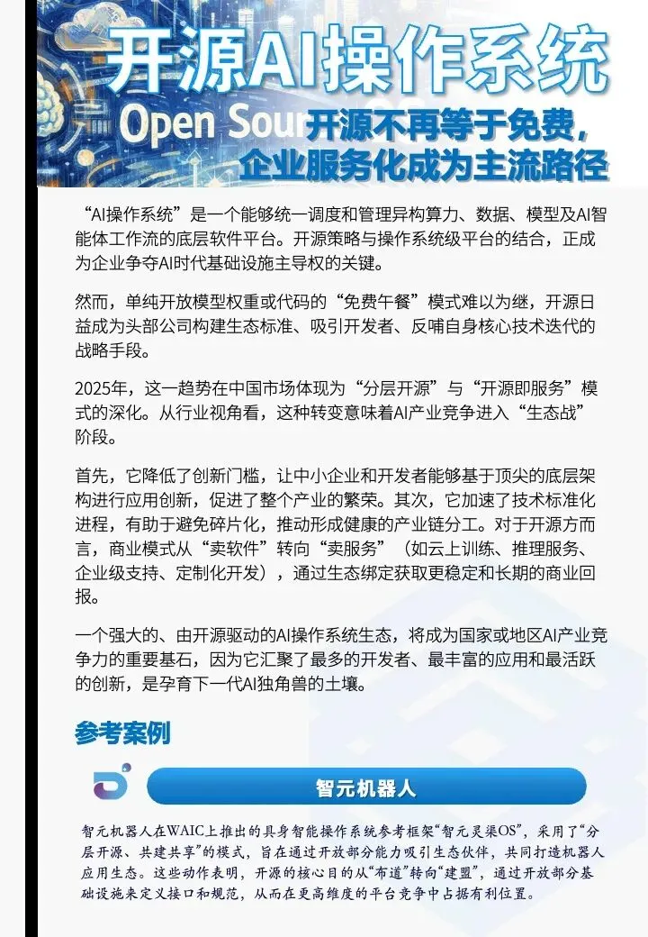 然而,开源不再等于免费,单纯开放模型权重或代码的“免费午餐”模式难以为继,开源日益成为头部公司构建生态标准、吸引开发者、反哺自身核心技术迭代的战略手段,企业服务化将成为主流路径。