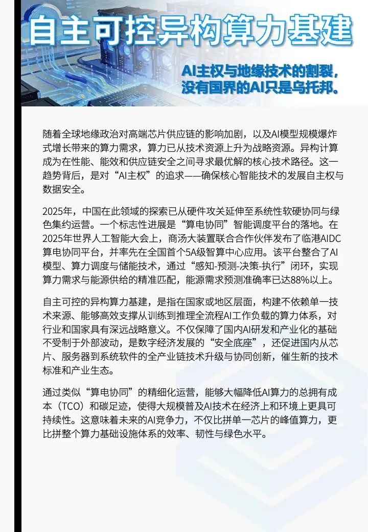 随着全球地缘政治对高端芯片供应链的影响加剧,以及AI模型规模爆炸式增长带来的算力需求,算力已从技术资源上升为战略资源。异构计算成为在性能、能效和供应链安全之间寻求最优解的核心技术路径。这一趋势背后,是对“AI主权”的追求——确保核心智能技术的发展自主权与数据安全。