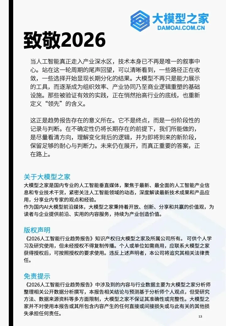 在这一背景下,《2026人工智能行业趋势报告》应运而生。基于真实的产业实践与前沿信号,梳理AI行业正在形成的结构性趋势,为读者呈现未来的关键变量与战略坐标。