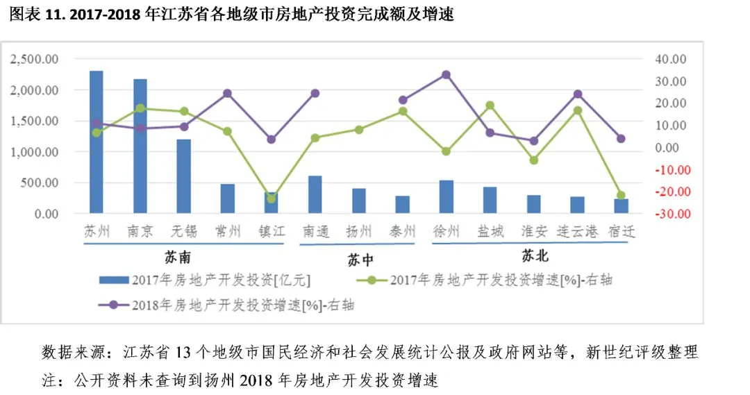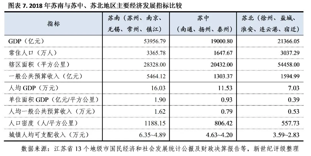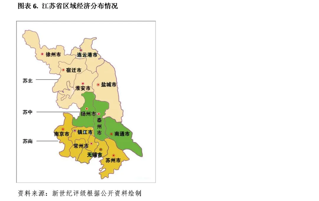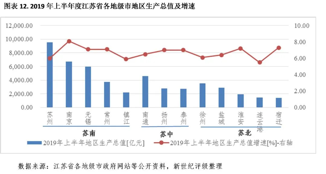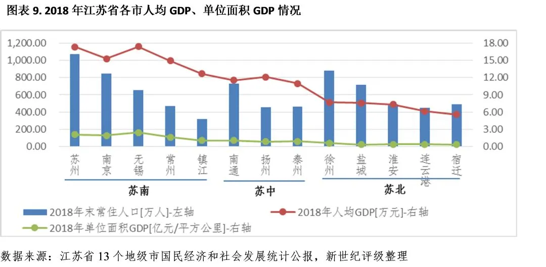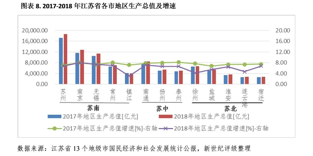 江苏省下辖13个地级市,以长江和淮河为界,分为苏南、苏中、苏北三个区域板块。其中,苏南地区包括南京、无锡、常州、苏州和镇江5市;苏中地区包括南通、扬州和泰州3市;苏北地区包括徐州、连云港、淮安、盐城和宿迁5市。江苏区域经济在人均GDP、单位面积GDP、人均可支配收入、人口密度等方面均呈现十分明显的梯度特征,南北发展差异较大;其中苏南地区位于“长三角经济区”中心区域,经济发展水平总体领先于苏中和苏北地区,经济实力和城市经济基础较好。2018年,江苏省各区域经济及财政状况继续出现分化,苏南地区GDP及一般公共预算收入增速总体保持平稳增长;苏中和苏北地区GDP增速下降幅度相对较大,多数地市呈现低速增长,一般公共预算收入均为增长态势,但增速总体落后于苏南地区。