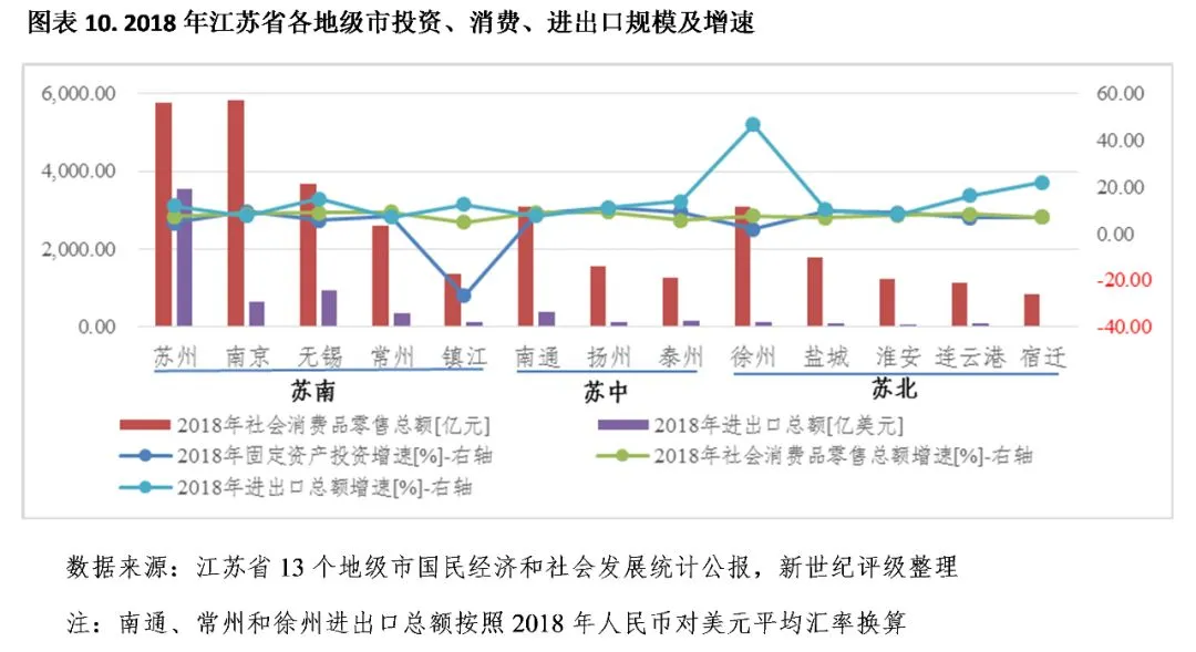 2018年江苏省各地市GDP总量排名与2017年保持一致,苏南、苏中和苏北地区人均GDP、单位面积GDP、人均可支配收入等方面继续呈现较明显的梯度分布。其中苏南地区的苏州、南京、无锡经济规模仍处于绝对领先地位,2018年地区生产总值均超万亿元,经济总量合计占全省的比重达45.44%。从增速看,2018年各市GDP增速较上年普遍出现不同程度的回落,其中盐城、连云港、徐州和镇江增速显著放缓,GDP增速在5.5%及以下。从三大需求看,多数地市固定资产投资增速回落,增速超过9%的地市仅扬州、南京、盐城、泰州和淮安5市;徐州、镇江则因二三产投资增速双降,2018年固定资产投资增速垫底,分别为2.0%和-26.5%,尤其镇江出现负增长。多数地市社会消费品零售总额及进出口总额增速有所回落,但增速水平总体尚可,其中受贸易环境影响,南京、常州、南通、泰州、淮安等部分地市进出口总额增速回落幅度较大。2019年上半年度,各市经济总量排名较2018年未发生变化,经济增速总体保持平稳,除苏州、无锡和南通外,其他地市增速均有所回升。