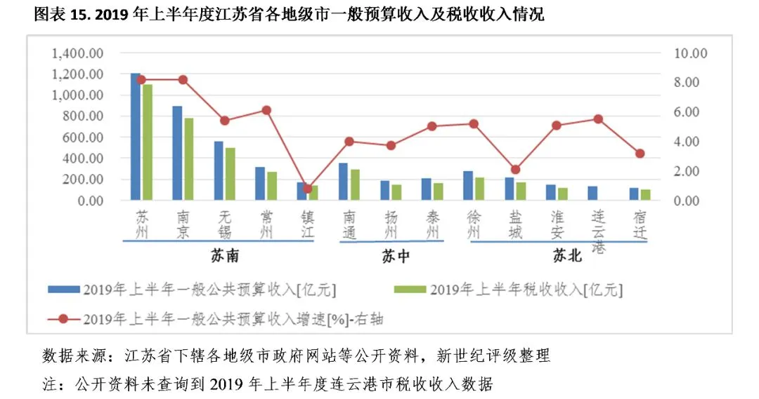 随着“营改增”因素消除,2018年江苏省各地级市一般公共预算收入均呈增长态势,但增速仍出现较大分化,苏南地区整体表现优于苏中和苏北地区;徐州、宿迁、南通3市仍为5%以下的低增速。2019年上半年,受主体税种增势放缓、减税政策效应等影响,各地级市一般公共预算收入增速较2018年普遍放缓,除南京、苏州和常州外,其他地市增速均在6%以下,其中盐城和镇江增速分别仅为2.1%和0.8%。