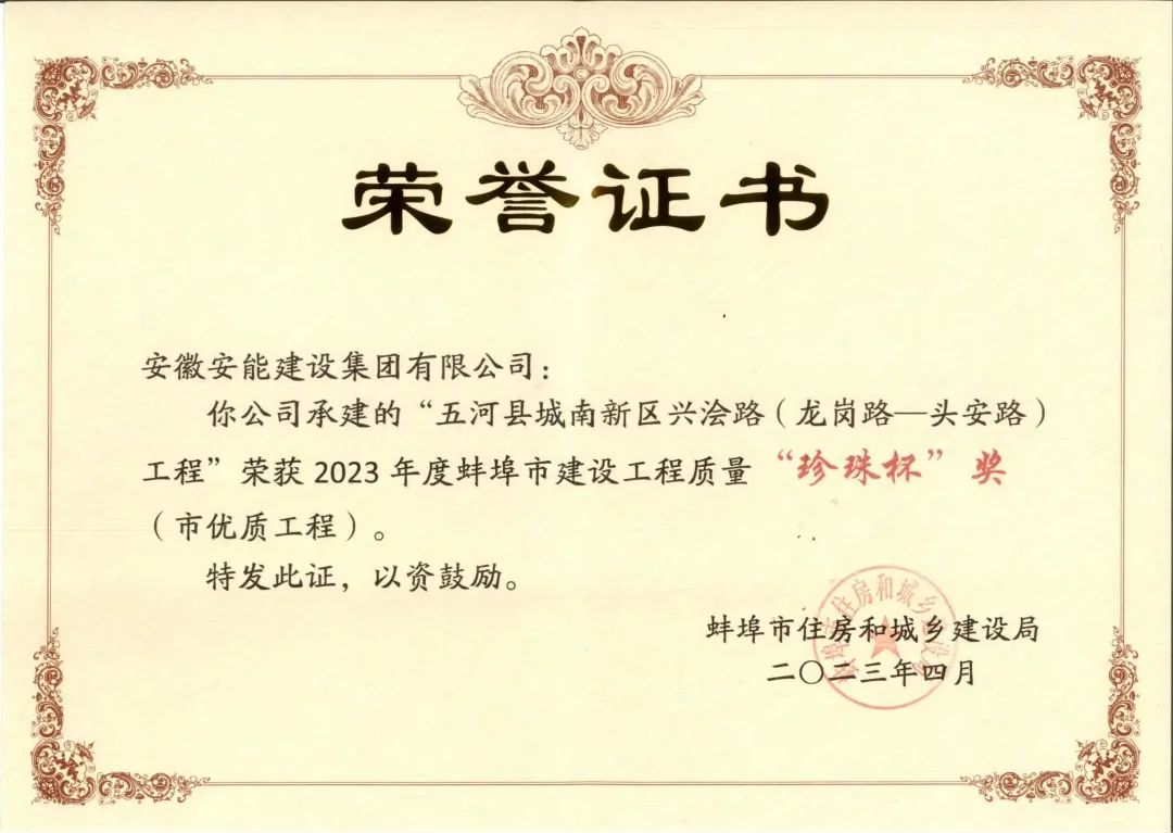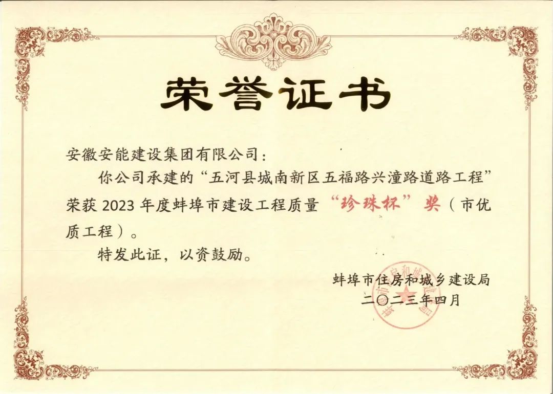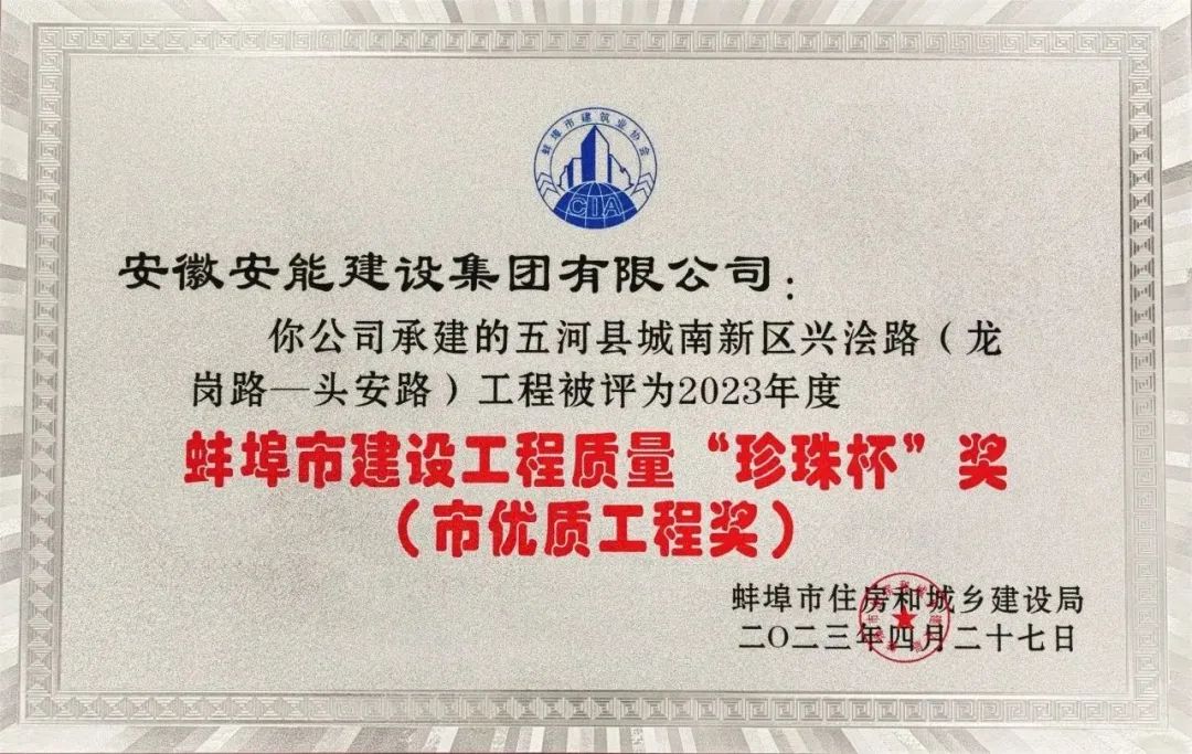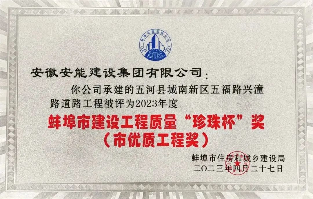 近日,蚌埠市住房和城乡建设局发布《关于公布蚌埠市2023年建设工程“珍珠杯”奖获奖项目名单的通知》,由集团公司承建的“五河县城南新区五福路兴潼路道路工程”及“五河县城南新区兴浍路(龙岗路—头安路)工程”两个项目榜上有名,均荣获2023年度蚌埠市建设工程质量“珍珠杯”奖(市优质工程奖)。